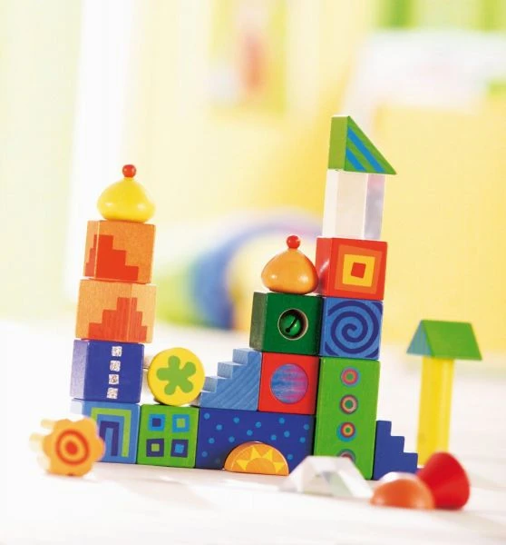 Bausteine aus Buche und Acryl, teilweise mit Folienaufdruck.