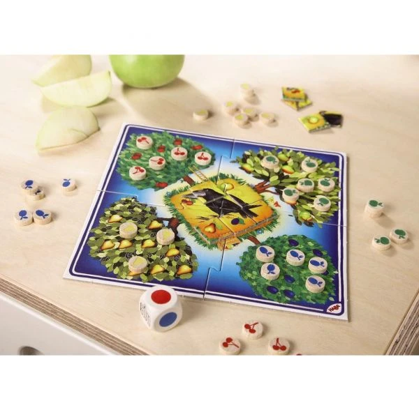 Wer kann die reifen Früchte schneller sammeln, der freche Rabe oder die Kinder?