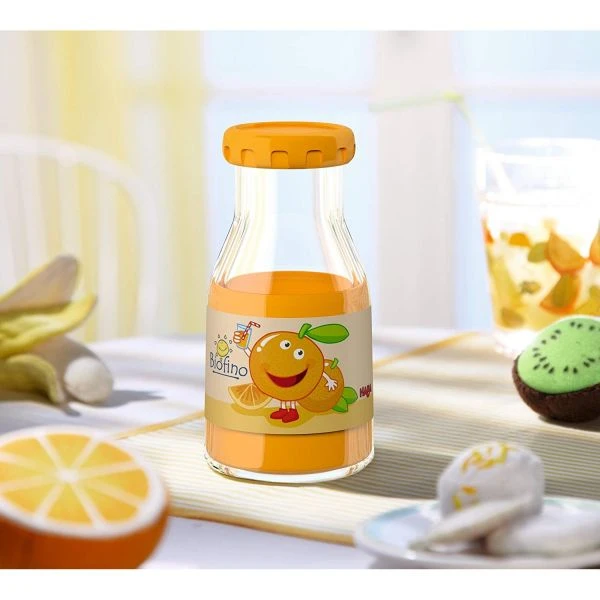 Jeden Tag Obst und Gemüse, darauf achten kleine Puppeneltern genauso sehr wie große. Und wenn der kleine Teddy mal kein Obst essen mag, bekommt er ein Glas Orangensaft. Schließlich lädt die lustige Orange auf dem „Etikett“ so nett zum Trinken ein. Neben seinem liebevollen Dekor hat der HABA-Orangensaft aber auch noch einen spannenden „Kippeffekt“. Dreht man die Flasche auf den Kopf, verschwindet die Flüssigkeit in den Deckel der Flasche. So können die Kleinen ihren Orangensaft fast wie in echt „verbrauchen“ und gleich wieder neuen einkaufen gehen.