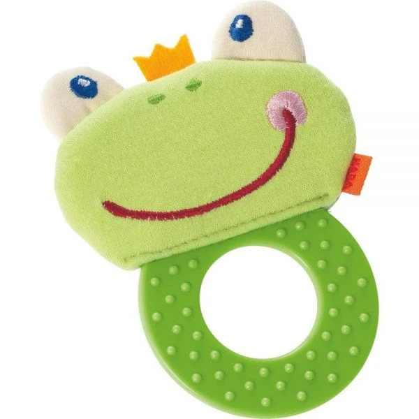 Beißring/Beißkerl Frosch von Haba, für die ganz kleinen ein niedlicher Frosch, auf dem sie vergnügt herumkauen können. Der kleine Frosch hat Ohren gefüllt mit Knisterfolie, der Beißring hat Noppen und beruhigt beim Zahnen.