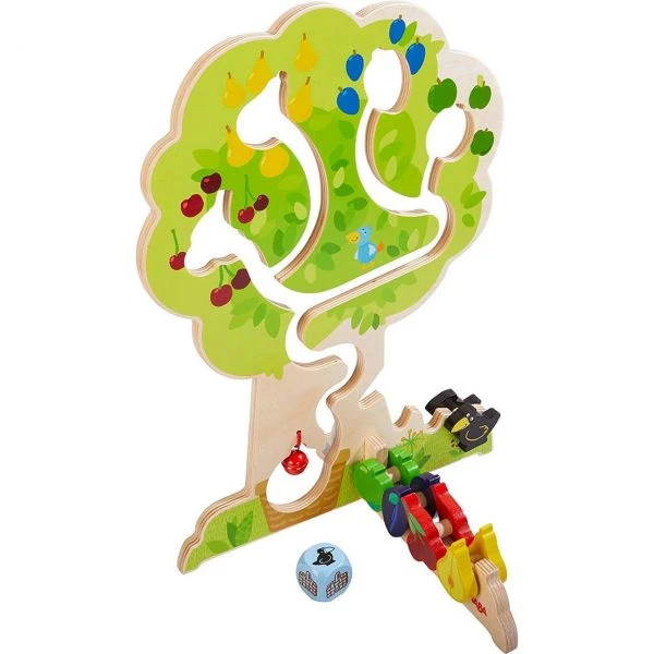 Die farbenfrohen Walzen bringen kleine Kinderhände auf Trab. Gespielt wird nach den einfachen Regeln des HABA-Spiele-Klassikers Obstgarten: Die Kinder versuchen, allein oder gemeinsam, bei der Obsternte schneller zu sein als der freche Rabe. Natürlich macht es auch viel Spaß, die Walzen der Farbe nach zu sortieren oder nach Lust und Laune durch die Baumkrone zu schieben.