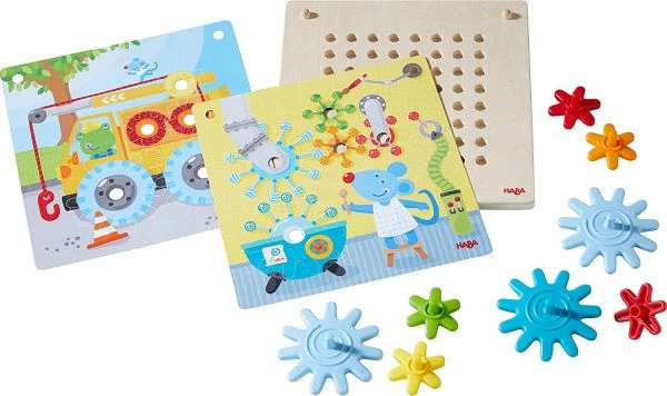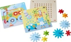 Auf den vier Hintergrundbildern lassen sich die großen und kleinen Zahnräder zu spannenden Werken zusammenstecken