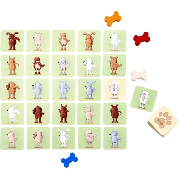 Auf der Hundewiese suchen die Besitzer verzweifelt nach ihren Lieblingen und brauchen dringend die Hilfe der Spieler: Sie müssen genau hinschauen, um herauszufinden, welche Hunde-Popos zu welchen Hunde-Fotos passen. Dann heißt es schnell zuschnappen! Doch aufgepasst: Manche Hunde sehen sich zum Verwechseln ähnlich. Wer die meisten Hunde gefunden hat, gewinnt.