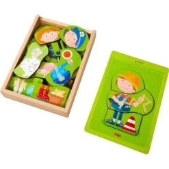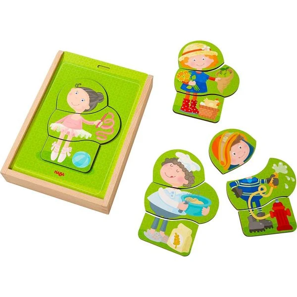 Wer hat die bunte Farbrolle, wer benutzt den Schneebesen und wer einen Zollstock? Welcher Beruf welches Utensil zugeordnet bekommt, bestimmen die kleinen Puzzlefans selbst. Wer mag, würfelt die einzelnen Puzzleteile auch mal bunt durcheinander. So entstehen viele lustige Berufe-Kombinationen. Im Schiebedeckel ist der Puzzle-Rahmen, die Puzzleteile sind in der Box gut verstaut.