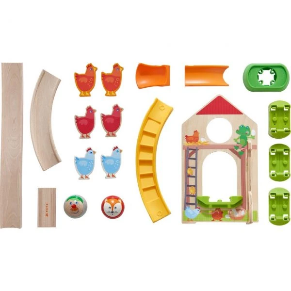 - die Kullerbü-Kugelbahn Hühner-Domino sorgt für maximale Kuller-Action durchs Scheunentor