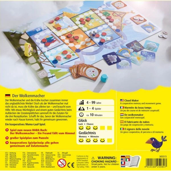 Schaffen sie es, bevor der Wolkenmacher wieder nach Hause kommt, haben sie gemeinsam gewonnen. Das kooperative Memo-Lauf-Spiel ist eine prima Ergänzung zum neuen HABA Buch: Der Wolkenmacher – Ein Freund fällt vom Himmel (305532).