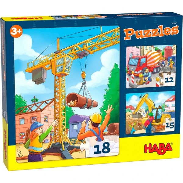 HABA Puzzle für Kinder ab 3 Jahren mit 12, 15 und 18 Teilen mit Baustellen Fahrzeugen Motiv