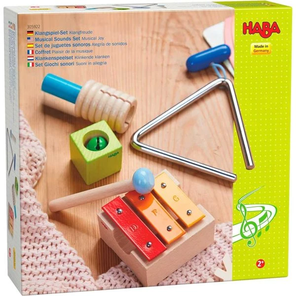 Mit dem Klangspiel-Set Klangfreude von HABA macht das Musizieren besonders viel Spaß, denn mit Triangel, Akustikstein, Mini-Metallophon und Ratterstab lassen sich die unterschiedlichsten Klänge und Melodien erzeugen