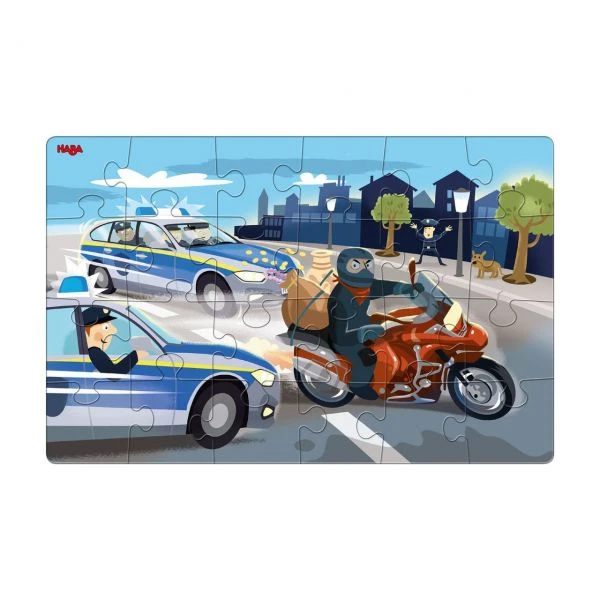 Die HABA Puzzles Im Einsatz enthalten gleich zwei spannende Motive: Achtung, der Räuber fährt mit gestohlener Beute auf dem Motorrad davon! Doch die Polizeifahrzeuge sind schneller und umzingeln den Dieb. Rechtzeitig ist auch die Feuerwehr vor Ort, um den Hausbrand zu löschen. Ein Hubschrauber verfolgt den Einsatz aus der Höhe.
