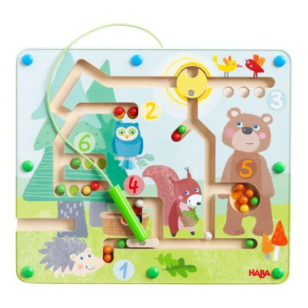 Über Baumwipfel und durch das Unterholz können kleine Entdecker die Kugeln mit dem Magnetstab dem jeweils passenden Waldfreund zuordnen