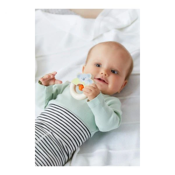 Dieser robuste Holz-Greifling fasziniert Babys durch sein niedliches Motiv