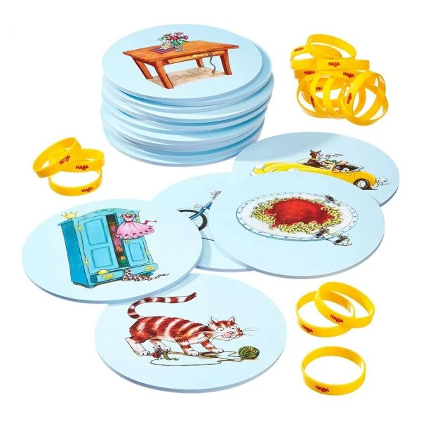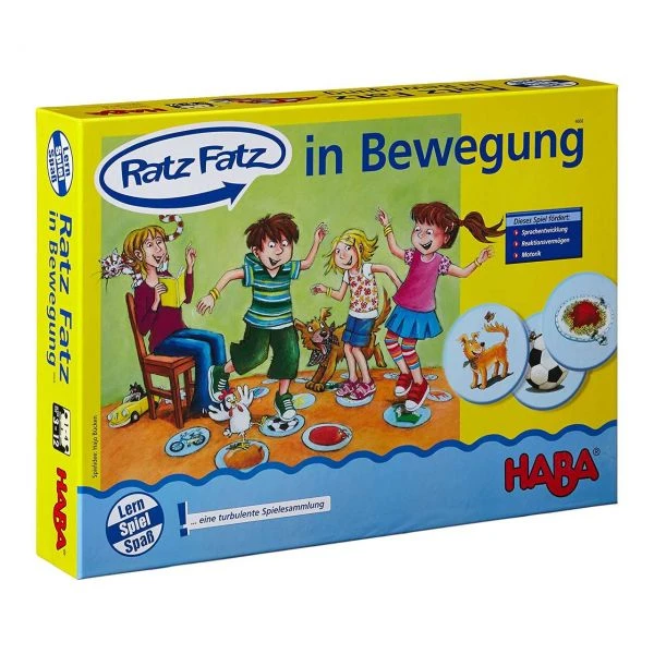 Ratz Fatz in Bewegung von HABA ist ein besonders rasantes Spiel, denn alles spielt sich auf dem Boden ab. Wer springt zuerst auf das Fahrrad? Wer rennt am schnellsten dem Zug hinterher? Und wer wirft zielsicher den Schrank in die Schachtel? In diesen und anderen lustigen Aktionen verbinden sich für Kinder Zuhören und Bewegung zu einem besonderen Lernspielspaß. Je nach Spielidee heißt es „Erkennen & Rennen“, „Merken & Suchen“ oder „Rätseln & Werfen“. Wer die Aufgaben am Besten löst, bekommt ein gelbes Armband als Belohnung. Und ganz nebenbei wird auch noch die sprachliche Entwicklung gefördert.